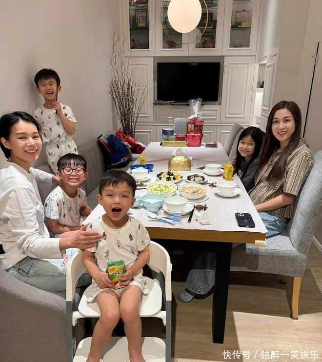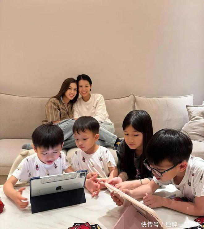 贴文附上一张照片,画面中两位靓妈——钟嘉欣与胡杏儿坐在沙发上,胡杏儿的三个儿子李奕霆(Brendan)、李奕霖(Ryan)、李奕宏(Liam)正与钟嘉欣9岁的女儿梁爱晨(Kelly)开心玩耍。
